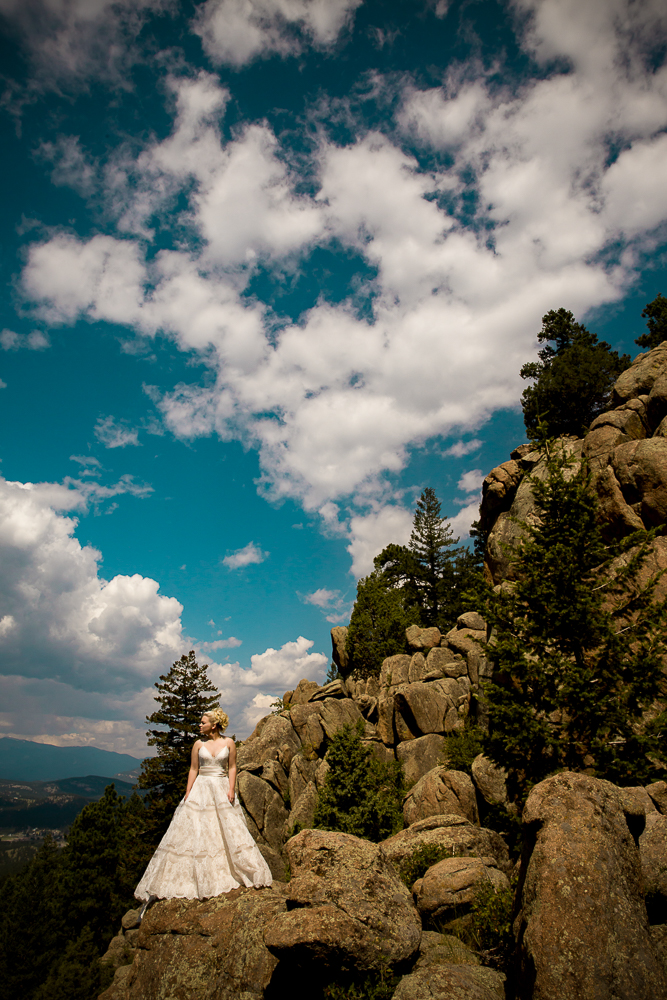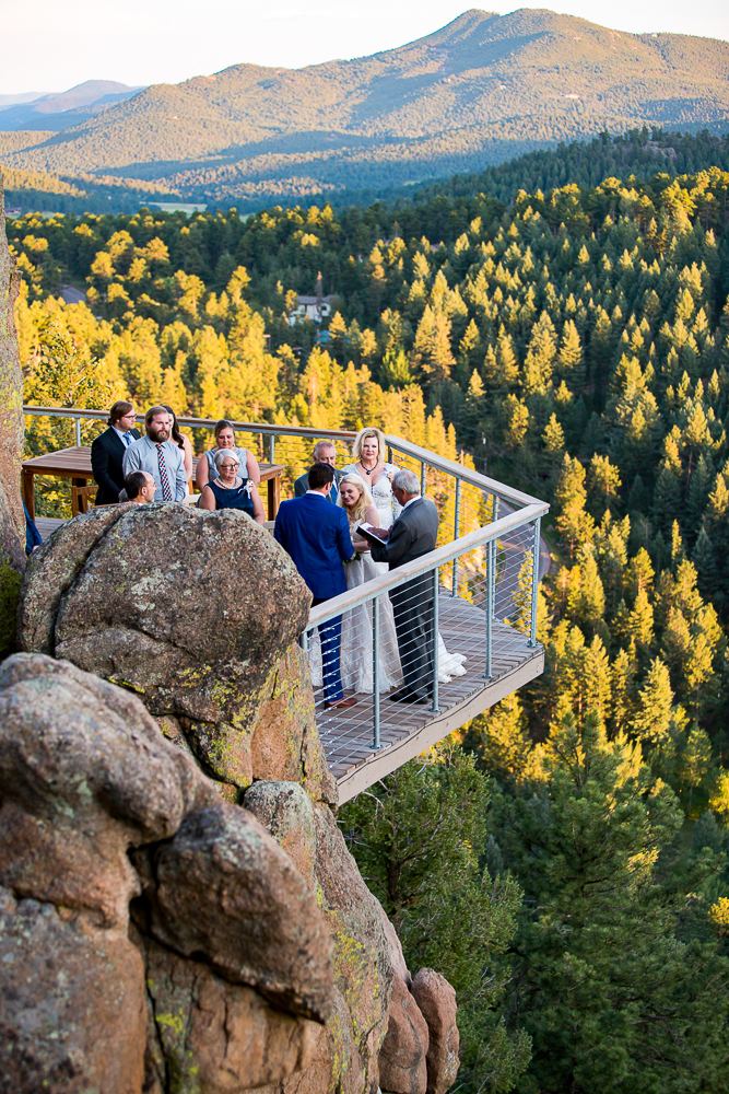 Wedding Colorado. Our most recent wedding was photographed high above the clouds in Evergreen Colorado. Elise and Tony called me almost a year ago to see if there was any way possible that I could photograph their wedding in Colorado. I instantly said yes (checking my google calendar at the same time to make sure I was available). They also wanted my wife Janice to be their hairstylist for their big event. They found this amazing mansion sitting on the tip top of one of the highest mountains in Colorado, I kid you not, we literally were perched over a 500 foot deep ravine hanging over the cliffs. An 8000 sq feet home with scenic overlooks, indoor waterfalls, a waterfall hot tub, room to sleep 16 guests, a full game room and a giant movie theatre. Their ceremony site was on a massive deck perched over the mountainside with a view for miles and miles.